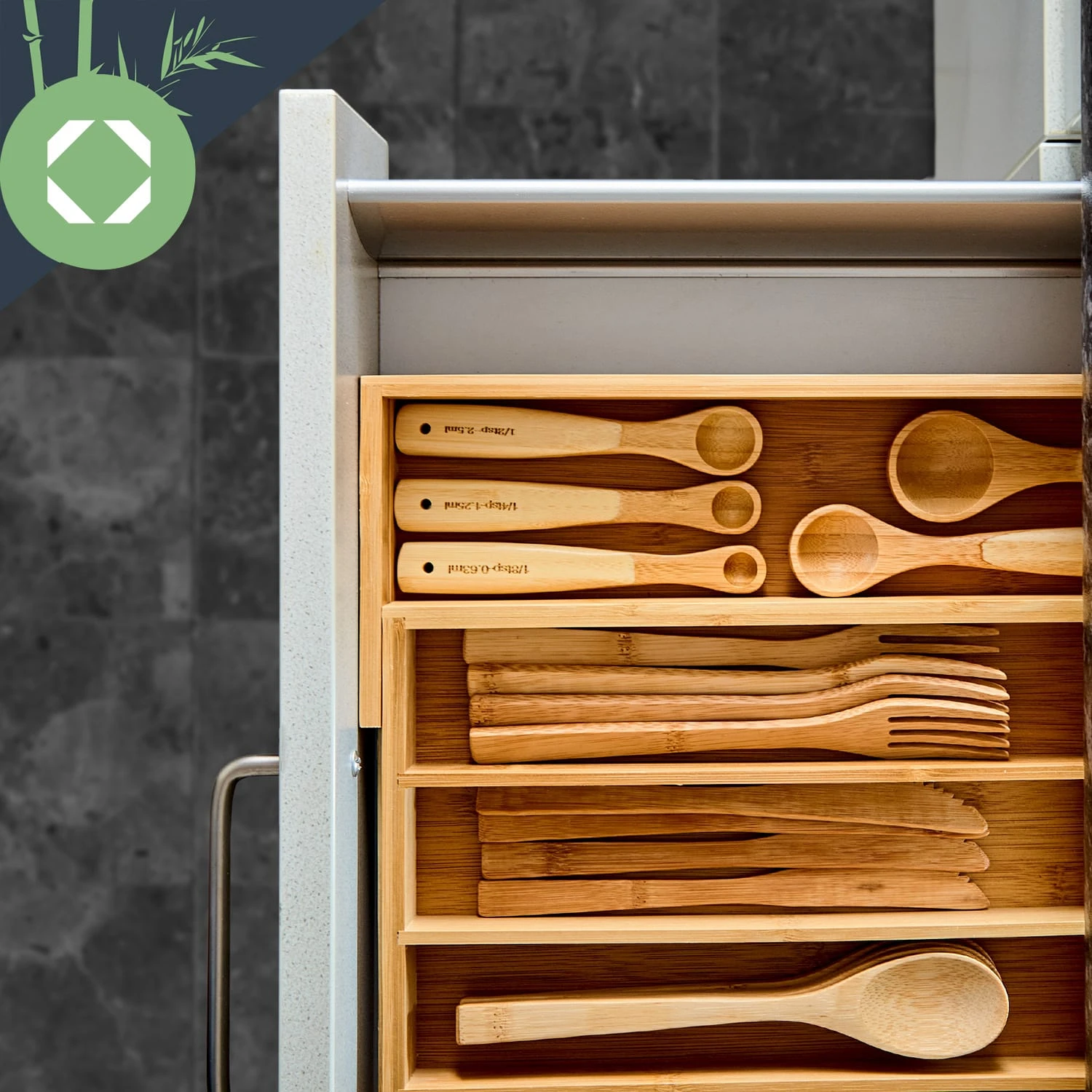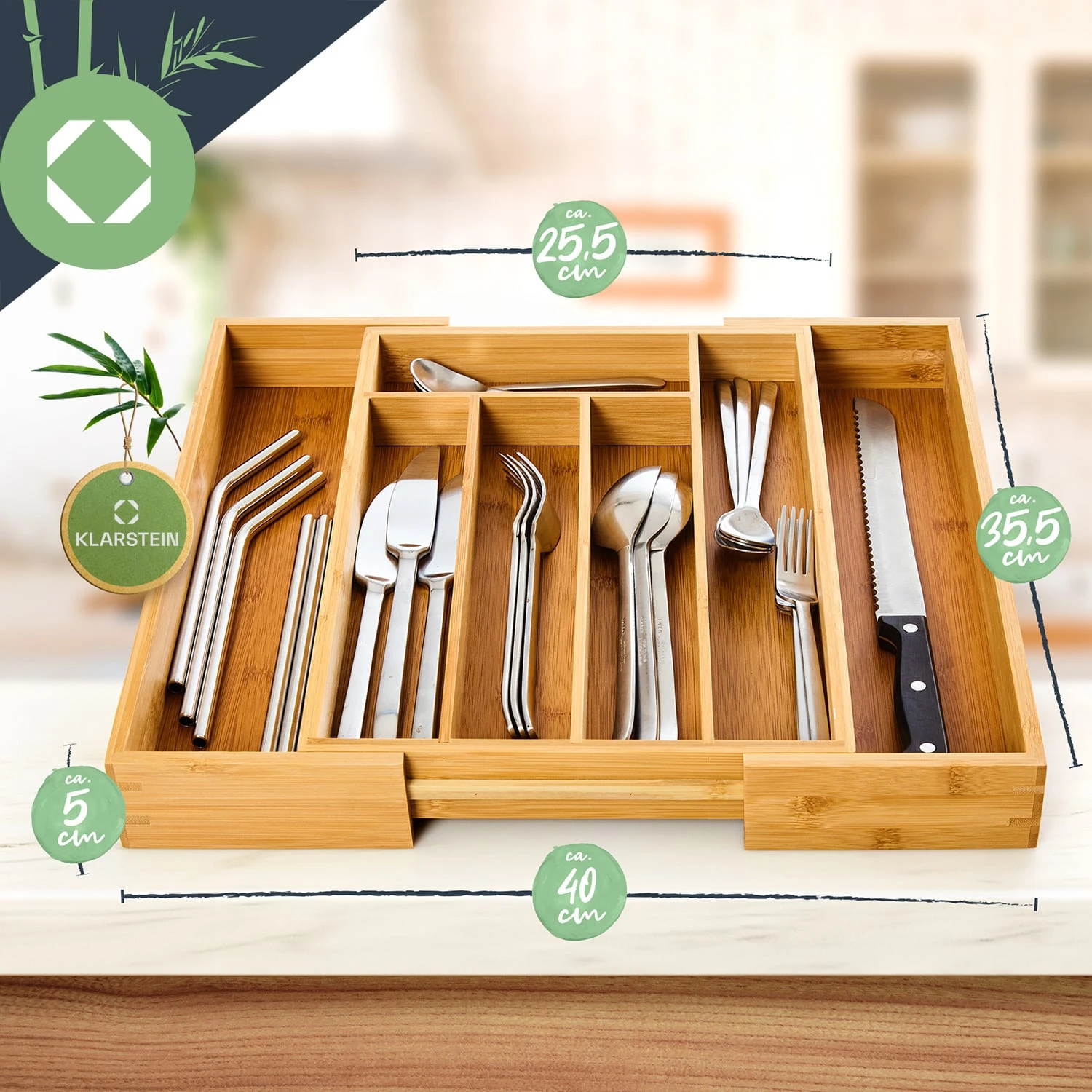 Modernes Schubladeninlet mit Anpassungsfähigkeit: Der Klarstein Besteckkasten aus nachhaltigem Bambus.