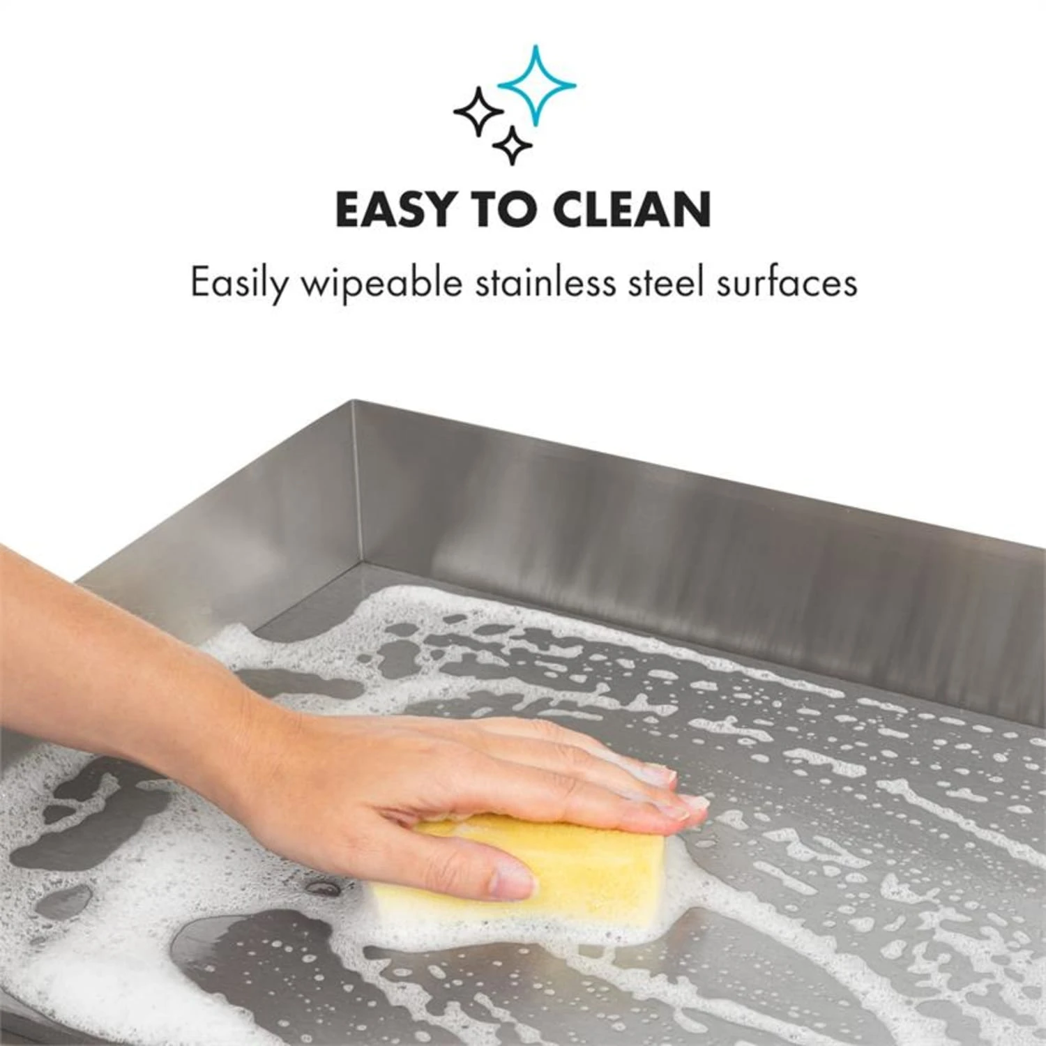 Mit dem Klarstein Grillmeile 3000G Elektrogrill hat der kleine Hunger keine Chance. Mit 3000 Watt Leistung bräunt und gart er ohne Unterlass Steaks, Würstchen oder direkt ganze Pfannengerichte. Besonders praktisch ist dabei seine stufenlos regulierbare Temperatur von 50 bis 300 °C – so ist er richtig heiß, wenn schnell viele Kunden mit Grillspezialitäten versorgt werden müssen und kann auf energiesparendes Warmhalten gestellt werden, wenn der Andrang etwas nachlässt. Die große Gusseisen-Grillplatte von 54,5 x 35 cm bietet sich mit ihrer glatten Oberfläche vor allem für Pfannengerichte an, die direkt auf der Platte gegrillt und gewendet werden, ohne das irgendwo etwas anbäckt. Ein umlaufender Spritzschutz sorgt für die Sicherheit der Kundschaft und bietet praktischen Widerstand beim Wenden. Überschüssiges Öl fließt in die herausnehmbare Auffangschale und kann am Ende des Grillevents einfach entsorgt werden.