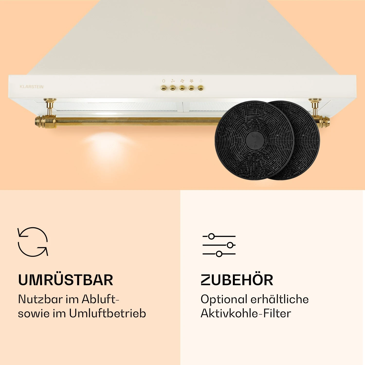 Mit der Klarstein Montblanc 60 Dunstabzugshaube verschwinden Dampf und Brodel schneller als deine Töpfe sie erzeugen können. 165 Watt Motorleistung und 3 Ventilationsstufen saugen bis zu 610 m³ Luft pro Stunde durch den Abluftschlauch nach draußen. Die zuschaltbare LED-Kochflächenbeleuchtung sorgt für erhellende Einblicke in Pfannen und Töpfe. Der zweiteilige, höhenflexible Kamin verbirgt geschickt den Abluftschlauch und eine schmucke Reling an der Abzugshauben-Unterseite dient der stilvollen Aufbewahrung von Küchenhelfern.