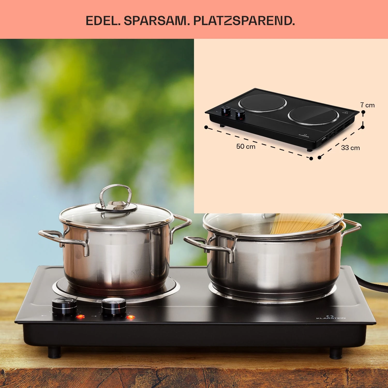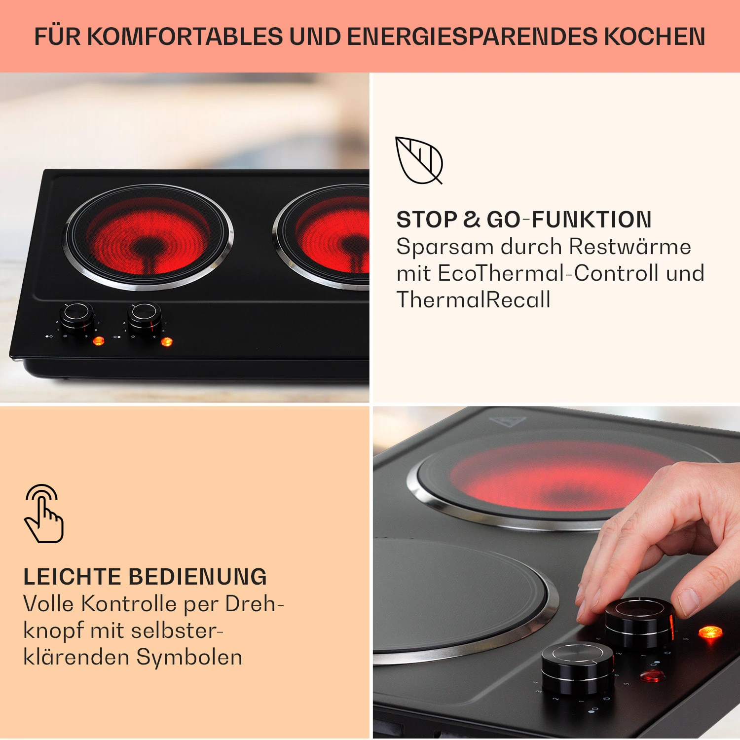 Bedient werden die beiden Kochzonen des Kochfelds unkompliziert mit zwei Thermostat-Drehreglern. 11 Leistungsstufen ermöglichen dabei sanftes Köcheln genauso wie rasantes Erhitzen und Braten. Die erhitzte Oberfläche erlaubt auch nach dem Abschalten das sparsame Kochen mit Restwärme. Nach dem Kochen ist die Kochplatte dank ihrer pflegeleichten Kombination aus Edelstahl und Glaskeramik im Handumdrehen wieder sauber. Dank der kompakten Größe eignet sich das Klarstein Ramsey Doppelkochfeld ideal als mobiler Reisebegleiter, zum Beispiel bei Campingtouren oder für die Sommerfrische im Gartenhäuschen.