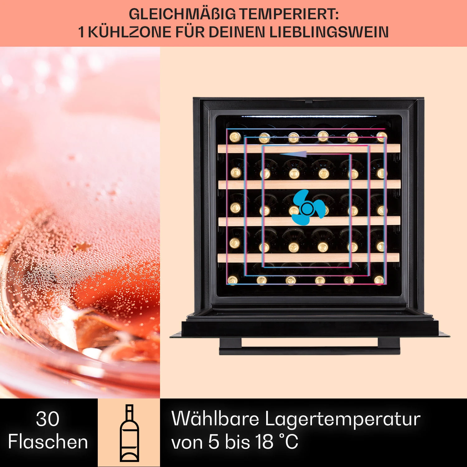 - Kapazität (Flaschen): 30 (Standard 0,75-Liter-Bordeaux-Flasche)